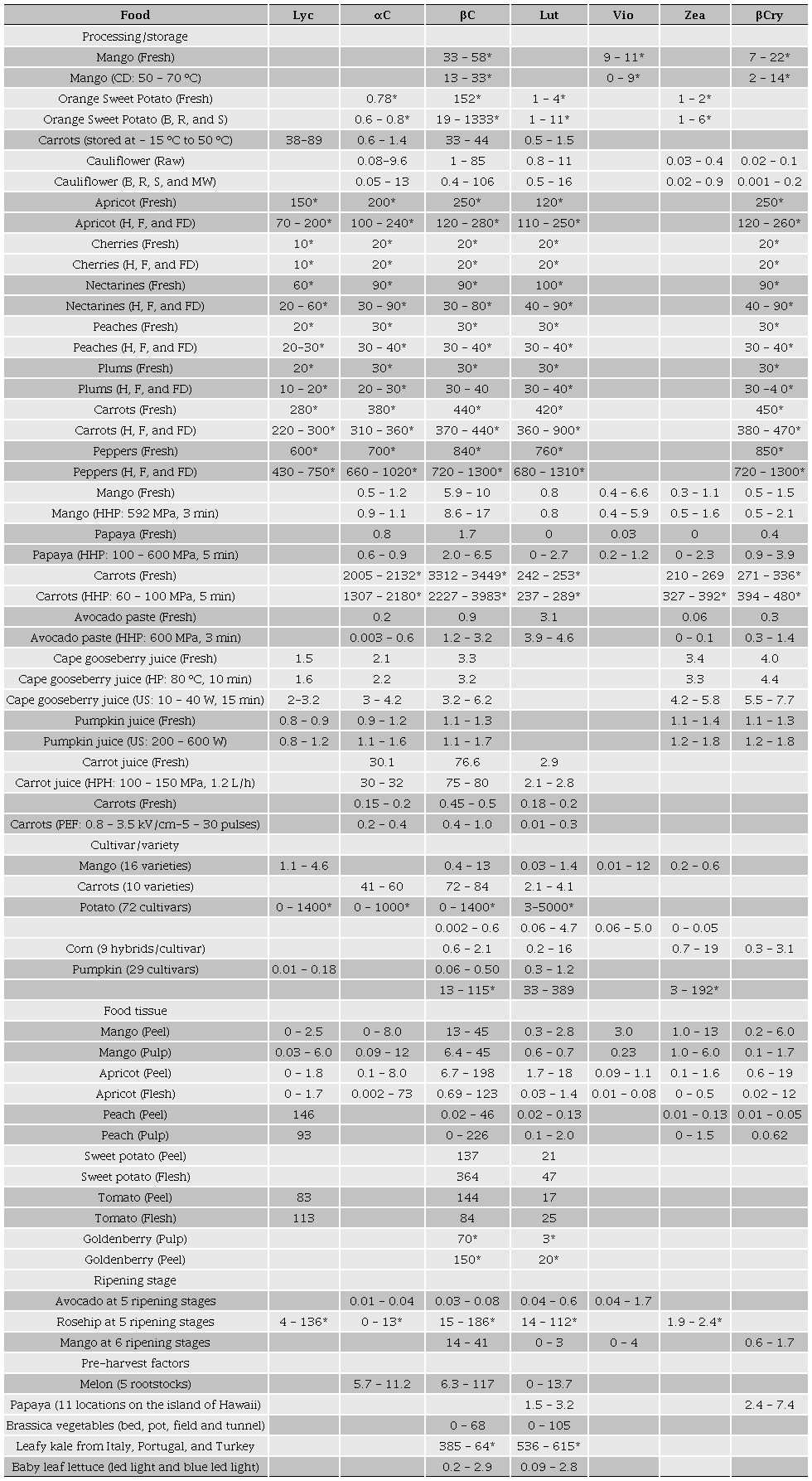 Carotenoids do not accumulate homogeneously in plant foods, and their content also depends on genotype (Kljak et al., 2015). The geographical origin of plant foods also alters the carotenoid content in foods, since it is influenced by environment temperature, exposition to light, and rain (Laurora et al., 2021). Processing also alters significantly the carotenoid content in plant foods because carotenoids are prone to degradation, transformation or isomerization under light exposition, heating and alkaline or acid conditions. New processing techniques (e.g., pulsed electric fields, ultrasound, high hydrostatic pressures, high pressure homogenization, etc.) reduce the negative effects of conventional processing techniques on carotenoid content (López-Gámez et al., 2021), however, mincing, chopping or homogenizing are enough to alter the carotenoid content in fruits and vegetables (Yahia et al., 2018). Undoubtedly, other factors can alter the content of carotenoids in plant foods (Table 1).