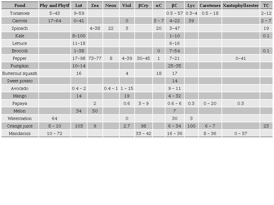 Carotenoids present in foods as lipid-based forms, are readily released from the food and then incorporated into the oily phase of chime, as compared to carotenoid crystals or carotenoid-protein complexes (Schweiggert and Carle, 2017). That is the reason why β-carotene from some fruits (e.g., tomatoes and mango) is more bioavailable than β-carotene from carrots or spinach (Ornelas-Paz et al., 2010).