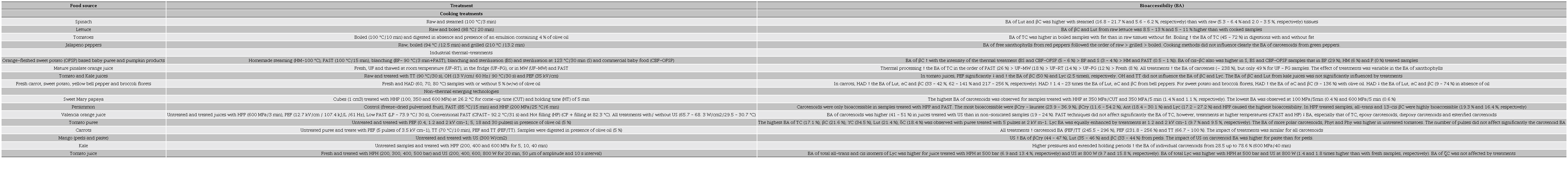 Food processing alters the effect of food matrix. Cooking and mincing favor carotenoid release from food during digestion, increasing the micellarization and absorption of these compounds (Table 3) (Li et al., 2016; Eriksen et al., 2017; De Oliveira et al., 2020). Industrial processing also increases the bioaccessibility of food carotenoids (Dhuique-Mayer et al., 2018; Mapelli-Brahm et al., 2018; Zhong et al., 2019). Non-thermic technologies (e.g., high hydrostatic pressurization, high pressure homogenization, pulsed electric fields and ultrasound) also increase the bioaccessibility of carotenoids (Lara-Abia et al., 2021; López-Gámez et al., 2021). The increase of carotenoid bioaccessibility is a consequence of the processing-mediated softening of food (cellular disruption). Ripening also causes softening of fruits, favoring the release of carotenoids during digestion. However, ripening also favors the esterification of carotenoids with fatty acids, reducing their polarity and, consequently, their micellarization rate and bioavailability (Cervantes-Paz, et al., 2012; Victoria-Campos et al. 2013).