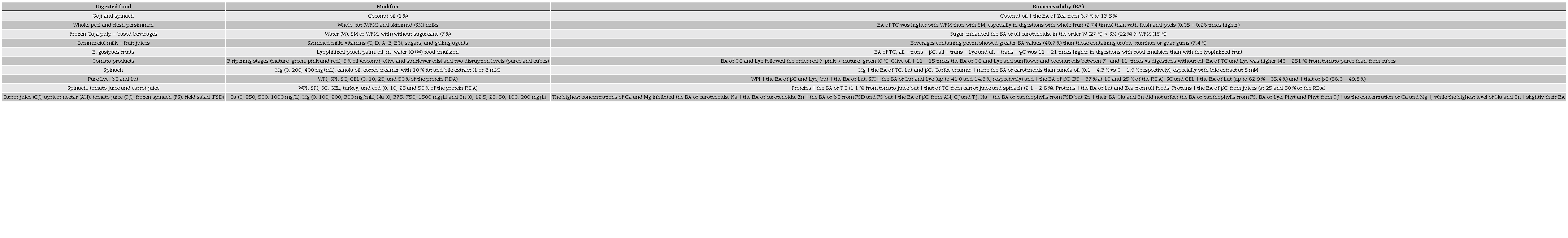 Protein improves the bioaccessibility of dietary carotenoids due to its emulsifying properties (Iddir et al., 2021). The carotenoid dose also influences the carotenoid absorption rate, with low doses resulting in a higher carotenoid absorption than large doses (Yahia et al., 2018). Under gastrointestinal conditions, there is a competence among carotenoids for absorption, thus the inclusion of a new carotenoid in the diet will cause a reduction in the absorption of other carotenoids. In some cases, the inclusion of xanthophylls causes a decrease in carotene absorption while in other cases the opposite has been observed (Kopec and Failla, 2018). The effect of some modifiers on carotenoid bioaccessibility is shown in Table 4.