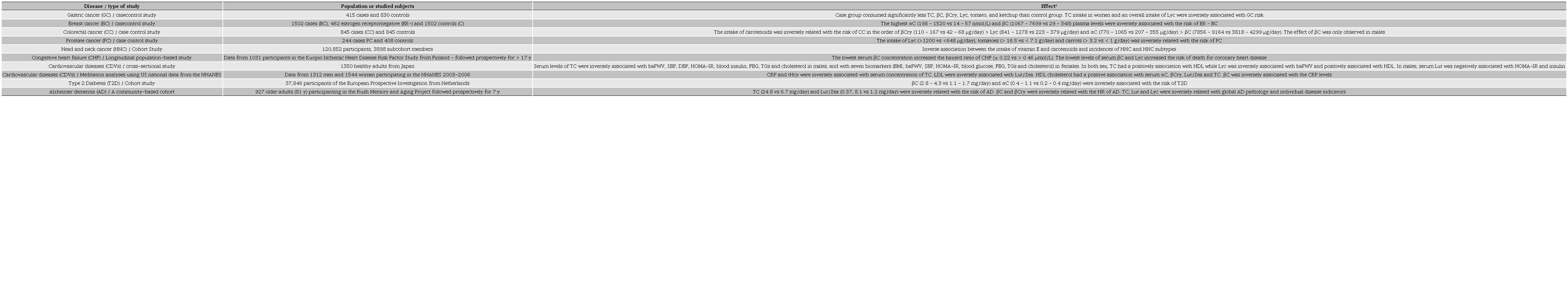 Other beneficial effects of carotenoids include the protection of photodamage of skin, cytoprotection against mycotoxins, human growth, reproduction and immune function, among other beneficial effects (Yahia et al., 2018; Swapnil et al., 2021). Table 5 summarizes the results of some recent epidemiological studies on the effect of carotenoids on human health.