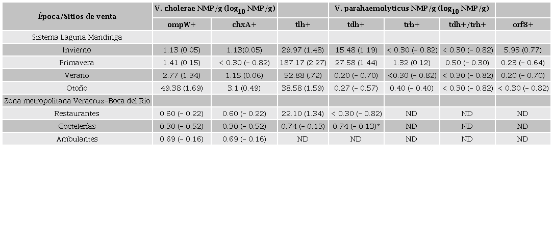 Los ostiones colectados de los bancos del SLM presentaron densidades medias de V. cholerae no-O1/no- O139 no patogénicas (ompW+) y patogénicas (chxA+) altas (p > 0.5) durante el verano y el otoño, mientras que las densidades elevadas (p > 0.5) de V. parahaemolyticus no patogénicas (tlh+) y patogénicas (tdh+, trh+, tdh+/trh+) ocurrieron en primavera, verano y otoño y las de orf8+ en invierno. En la venta al público, las densidades medias no patogénicas (ompw+) y patogénicas (chxA+) de V. cholerae no-O1/no-O139 en los cocteles de ostión crudo fueron más altas (p > 0.5) en los puestos ambulantes (0.69 NMP/g) y en los restaurantes (0.60 NMP/g), mientras que las de V. parahaemolyticus tlh+ fueron altas (22.10 NMP/g) (p > 0.5) en restaurantes y las de V. pa-rahaemolyticus tdh+ fueron significativamente (p < 0.5) más altas (0.74 NMP/g) en coctelerías (Tabla 1).