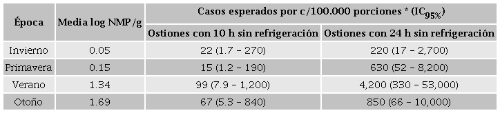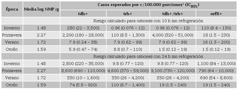 El riesgo promedio por consumir ostión crudo del SLM sin refrigerar 10 h y contaminado con V. cholerae no-O1/ no -O139 chxA+ se estimó de 99 casos/100,000 porciones en verano, 1.5-6.6 veces mayor al calculado para las otras estaciones. Sin embargo, el riesgo promedio es clasificado como bajo. En contraste, el riesgo en ostiones con 24 h sin refrigeración durante el verano fue 42.4 veces mayor al calculado con 10 h sin refrigeración. No obstante, el riesgo por consumir ostiones con 24 h sin refrigeración en las estaciones de invierno, primavera y otoño se consideraría medio, mientras que en verano sería alto, ya que se esperarían 4.2 casos/100 porciones o cocteles de ostión consumidos. Respecto a V. parahaemolyticus (Tabla 3), el riesgo de enfermar por el consumo de ostión crudo sin refrigerar 10 h, fue alto en primavera para tdh+ y para tdh+/trh+ (4 casos/100 porciones), comparados al riesgo medio para orf8+ (1.1 × 10-3 casos) en invierno. Similarmente, el riesgo promedio por consumir ostiones contaminados con V. parahaemolyticus tdh+, trh+ y tdh+/trh+ con 24 h sin refrigeración fue mayor en primavera, representando un riesgo alto con un estimado de 4 a 9 casos/100 porciones y para la cepa pandémica (orf8+) en invierno con 1 caso/100 porciones, riesgo 10 veces mayor al calculado con 10 h sin refrigeración en ambos casos (Tabla 2).