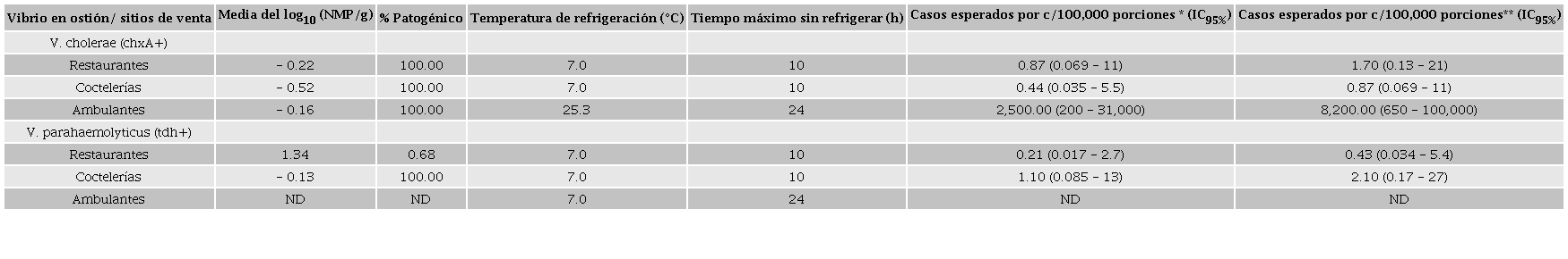 El riesgo promedio asociado con el consumo de cocteles de ostión crudo con 10 h sin refrigeración de venta en restaurantes y coctelerías contaminado con V. cholerae no-O1/no-O139 chxA+ fue menor a 1 caso/100,000 porciones; sin embargo, el riesgo por consumir cocteles en puestos ambulantes sería alto (2.5 casos/100 cocteles). De igual forma, el consumo de 24 ostiones por porción representaría un riesgo alto (8.20 × 10-2). Cabe mencionar que si bien el 100 % de las muestras presentó V. cholerae no-O1/no -O139 chxA+ en los tres sitios de venta (100 % de porcentaje patogénico), el riesgo promedio sería mayor para las personas que consumen en puestos ambulantes debido a la temperatura ambiente promedio considerada en el modelo. V. parahaemolyticus tdh+ se detectó en los cocteles de venta en restaurantes y coctelerías con un porcentaje patogénico de 0.68 y 100 %, respectivamente, estimándose un riesgo promedio de 0.21 y 1.10 × 10-5 casos con 12 ostiones por porción, respectivamente y de 0.43 y 2.10 × 10-5, respectivamente, con una porción de 24 ostiones, representando ambos un riesgo bajo. V. parahaemolyticus no se detectó en ostiones de puestos ambulantes, considerado como riesgo imposible (Tabla 4).