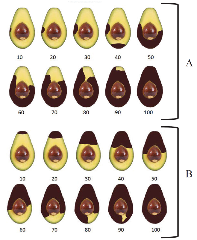 Al concluir el periodo de incubación se evaluó el efecto de los inóculos en las áreas pedunculares a través de la comparación de cortes longitudinales en los frutos y se determinó el porcentaje de daños basados en escalas de pudriciones de pedúnculo y cuerpo del fruto (Figura 1; Ochoa, 2014). Todos los experimentos se llevaron a cabo por triplicado.