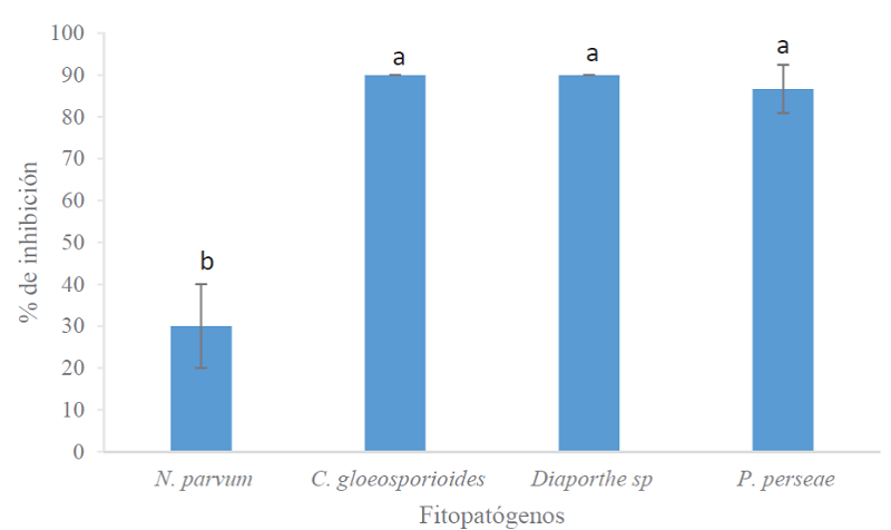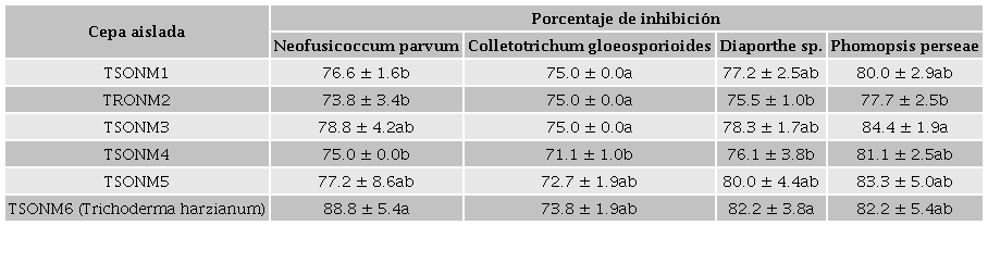 Los aislados de Trichoderma TSONM1, TRONM2, TSONM3, TSONM4, TSONM5 y T. harzianum presentaron diferentes niveles de actividad antagónica contra los fitopatógenos ensayados (N. parvum, C. gloeosporioides, Diaporthe sp. y P. perseae). La confrontación, permitió evidenciar a la cepa de T. harzianum con mayor capacidad antagónica frente a N. Parvum con 88.8 % de inhibición, misma que fue estadísticamente significativa al igual que la cepa TSONM3 Y TSONM5. Por otro lado, el resto de las cepas se mantuvieron en el rango del 73.8 al 77.2 % (Tabla 3), no observándose diferencias significativas entre ellas.