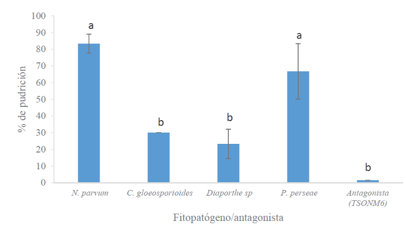 Por otro lado, en este estudio se visualizó una mayor susceptibilidad a la infección por N. parvum. Ochoa (2014) menciona que, durante la maduración, los niveles de compuestos antifúngicos en el fruto declinan, lo que permite que se active el crecimiento del hongo. Las células más externas de la cutícula y de la pulpa son colonizadas, llevando el desarrollo de los síntomas. Considerando que la inoculación de fitopatógeno sobre los frutos tuvo una concentración de 1 x 106 de esporas por mL, sería importante considerar lo mencionado por Gupta et al. (2014) , donde describe que, en su mayoría, los productos comerciales del mercado se formulan con una concentración de antagonista entre 1 × 108 y 1 × 109 UFC esporas viables/gramo de producto formulado. Por lo que T. harzianum (TSONM6) podría ser una buena alternativa para el control biológico del aguacate en postcosecha.