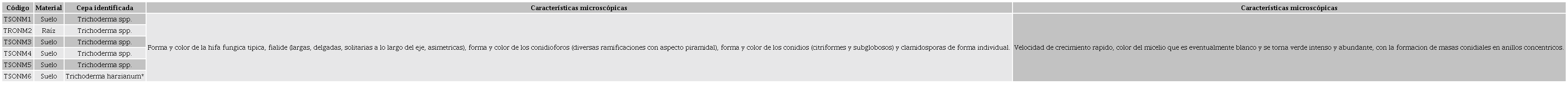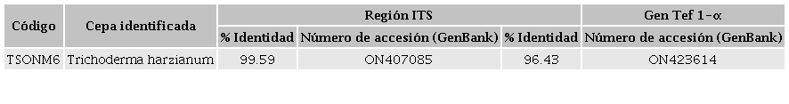 Se obtuvieron seis aislamientos de cepas nativas de suelo y raíz, de acuerdo con las características morfológicas (micro y macroscópicas) se identificaron como de Trichoderma sp. (Tabla 1). Se analizaron los conidios, fiálides, hifas y conidióforos presentes en el soma vegetativo. De acuerdo con la velocidad de crecimiento observada en cada aislado, se seleccionó la cepa TSONM6, para ser identificada molecularmente y utilizada en el ensayo in vivo. Al efectuar el análisis de la secuencia, se identificó como Trichoderma harzianum, mostrando un amplicón de 600 pb para ambos fragmentos, evidenciando una identidad del 99.59 y 96.43 % con ambos marcadores (ITS y gen Tef 1-α, respectivamente) (Tabla 2).