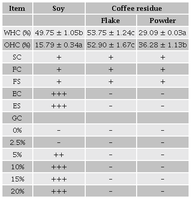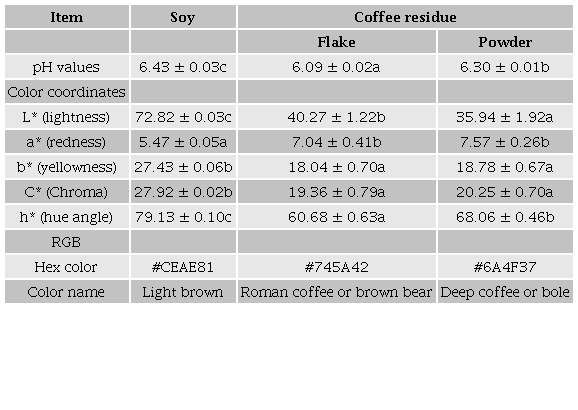 Table 1 reports the physicochemical properties of the coffee residues compared to the commercial standard. The results show that coffee silverskin powder and flake showed lower pH values than texturized soy (p < 0.05). Also, results of color parameters write down that coffee silverskin powder and flakes showed lower L*, b*, C* and h* values than texturized soy, as well as the highest a* values (p < 0.05), while coffee silverskin powder showed the lowest L* values (p < 0.05). In addition, the color data also includes information related to the RGB and Hex color of soybeans and the silverskin of coffee in flakes and flour, which according to these the color name is light brown, roman coffee or brown bear, and deep coffee or bole, respectively.