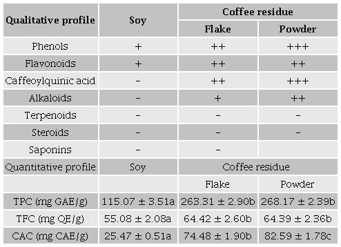 Moreover, phytochemicals (from the Greek word Phyto, meaning plant) are bioactive chemical compounds found in different amounts in plant parts (fruits, seeds, flowers, leaves, stems, and roots), which depends on plant species, growing, and processing conditions. Also, it is well known that phytochemicals improve the protection to plant cells against environmental hazards like pollution, stress, UV-exposure, and pathogenic damage. Although these compounds are not essential nutrients for human body, it has been reported that they exert several biological functions of interest for the food industry (Saxena et al., 2013). Table 3 reports the phytochemical content of the coffee residues compared to the commercial standard. The results of the qualitative phytochemical profile showed that phenols and caffeoylquinic acid were highly present in coffee silverskin powder, while these compounds were not detected in texturized soy. Flavonoids were moderately present in both coffee residues, and coffee silverskin flakes showed moderately presence of alkaloids. In addition, terpenoids, steroids, and saponins were not detected in all samples. Regarding the quantitative profile, both coffee residues showed high (p < 0.05) TPC and TFC values (>200 mg GAE and 60 mg QE/g, respectively) than texturized soy, while coffee silverskin powder showed high CAC (approx. 80 mg CAE/g) than coffee silverskin flakes and texturized soy (p < 0.05).