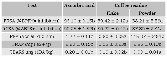 The Codex Alimentarius (1995) also indicate that food additives are used with preservative purposes, for example, to function as an antimicrobial agent and improve antioxidant effect against the oxidation process. In this regard, Table 4 shows the antioxidant properties of the coffee residues compared with a commercial antioxidant standard (ascorbic acid, Asc), and the results indicate that Asc showed higher FRSA (> 90 % of inhibition) than coffee silverskin powder and flakes (approx. 40 % of inhibition for both), while, Asc and coffee silverskin powder showed higher RCSA activity (approx. 90 % of inhibition for both) than coffee silverskin flakes (< 85 % of inhibition) (p < 0.05), which indicate a positive effect of milling procedure. Concerning reducing power, RPA and FRAP values were presented in the order Asc > coffee silverskin powder > coffee silverskin flakes (p < 0.05). In addition, coffee silverskin powder showed the lowest TBARS values (< 0.1 mg MDA/kg), which indicates a positive effect of the milling procedure.
