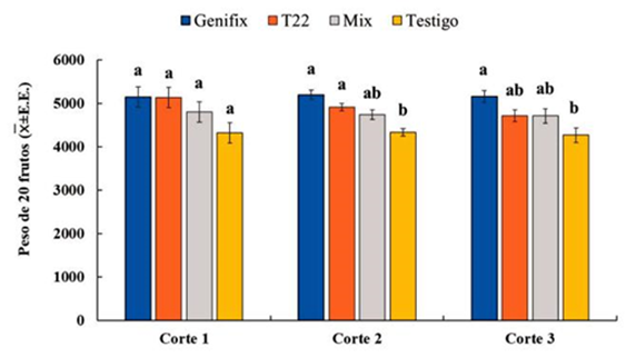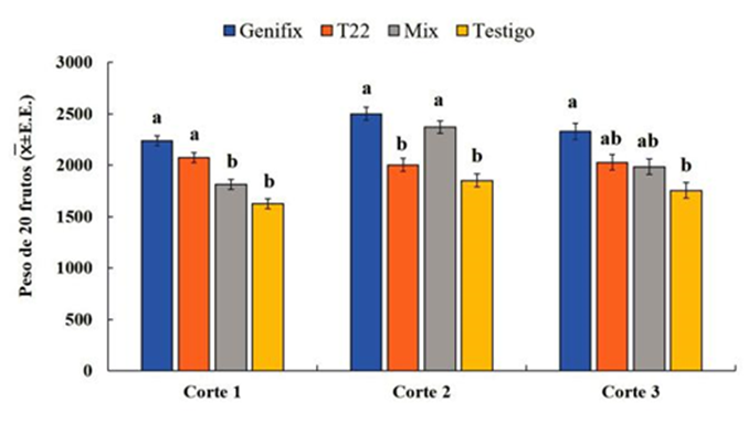 En cuanto al peso de muestras de 20 frutos de chile morrón (Figura 1), en el primer corte no se registraron diferencias significativas (F3,6 = 1.99, p = 0.2168), en el segundo las diferencias significativas (F3,6 = 13.74, p = 0.0043) mostraron que los frutos de plantas con Genifix® y T22® fueron superiores a los frutos de las plantas testigo. En el tercer corte, sólo la muestra de 20 frutos de plantas con Genifix® fueron significativamente (F3,6 = 5.68, p = 0.0346) más pesados que la muestra de 20 frutos de las plantas testigo (Figura 1).