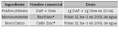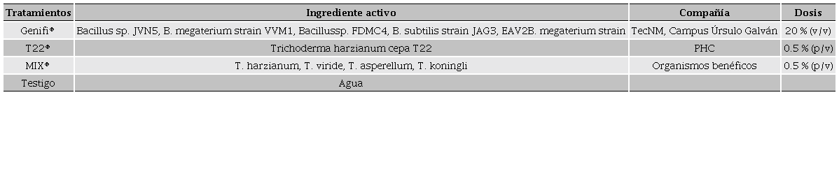 Los bioestimulantes que se utilizaron fueron productos a base de Trichoderma spp. y Bacillus spp., los cuales son hongos y bacterias respectivamente. En la Tabla 2 se muestran los tratamientos evaluados: 1) Genifix®, 2) T22®, 3) Mix® y 4) testigo, su composición y dosis de aplicación.