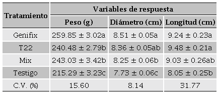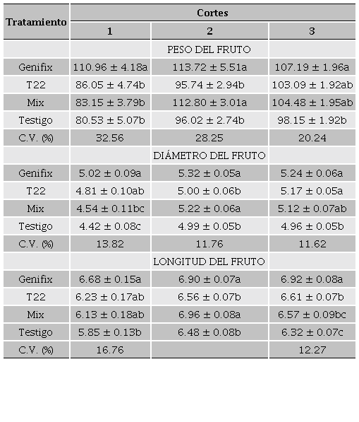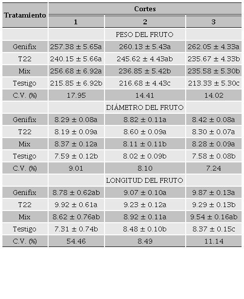 En cuanto al diámetro del fruto, las diferencias significativas en cada uno de los cortes (primero F3,196 = 9.70, p = 0.0001; segundo F3,196 = 15.61, p = 0.0001 y tercero F3,196 = 18.26, p = 0.0001) indicaron que los frutos de las plantas tratadas fueron superiores a los frutos de las plantas testigo (Tabla 3). En longitud de fruto, las diferencias significativas obtenidas en el primer corte (F3,196 = 2.40, p = 0.0491), mostraron que los frutos de las plantas con aplicaciones de T22® tuvieron mayor longitud en comparación a los frutos testigo. Para el segundo y tercer corte las diferencias significativas (F3,16 = 10.50, p = 0.0001 y F3,196 = 17.25, p = 0.0001respectivamente) señalaron que todos los bioestimulantes incrementaron la longitud de los frutos (Tabla 3). En el tercer corte el Genifix® fue superior al T22® en sus efectos sobre la longitud de los frutos.