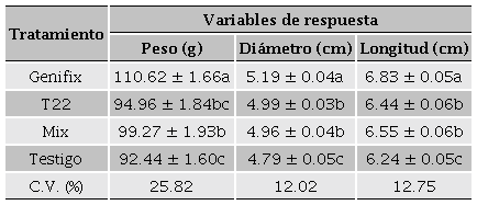 Los bioestimulantes T22® y Mix® tuvieron desempeños diferentes en el peso y dimensiones de los frutos, siendo ligeramente superior el bioestimulante T22®, lo cual puede explicarse al ser productos con cepas distintas, lo que permite la posibilidad de que tengan atributos bioquímicos diferentes; por ejemplo, en la producción de auxinas, ácidos orgánicos y solubilización de fosfatos inorgánicos, que permiten que una cepa sea mejor promotora de crecimiento a comparación de otras (Ortuño et al., 2013). Esto debido a que cada cepa y/o especie de Trichoderma posee diferentes atributos para la estimulación del crecimiento vegetal y desarrollo de frutos, lo cual se ha confirmado en trabajos como el de Larios et al. (2019), en el cual determinaron la efectividad de dos cepas nativas de Trichoderma sp. (SP6 y Clombta) en plantas de C. chinense var. “Chichen Itza”, encontrando que las plantas tratadas con Trichoderma cepa Clombta presentaron mayor crecimiento vegetal y desarrollo de fruto.