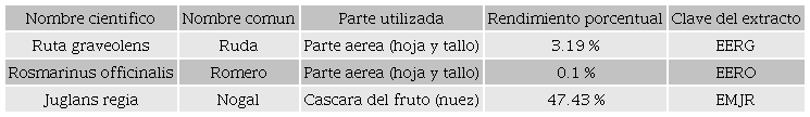 Las partes aéreas Ruta graveolens y Rosmarinus officinalis fueron colectadas en Iturbide, Nuevo León, México. Las cáscaras de nuez (Juglans regia) fueron donadas por la empresa Alanuez ubicada en Linares Nuevo León, México, como producto de deshecho. Las muestras fueron secadas a 60 ºC / 48 h en un horno de secado Yamato DX402C.