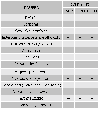 Los extractos se sometieron a una serie de pruebas químicas coloridas para determinar cualitativamente la presencia de metabolitos secundarios como: insaturaciones (KMnO4), carbonilo, grupos aromáticos, oxidrilos fenólicos (taninos vegetales), esteroles y triterpenos, carbohidratos, cumarinas, lactonas, sesquiterpenlactonas, alcaloides, flavonoides y saponinas, de acuerdo con Verde-Star et al. (2016) .