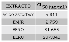 La capacidad antioxidante de los extractos se determinó por el método de DPPH• la absorbancia se midió a 519 nm en un espectrofotómetro (Jenway 6320D) (Gutiérrez et al., 2008) utilizando ácido ascórbico como control positivo. Se realizaron diluciones seriadas de los extractos y cada concentración se evaluó por triplicado, se aplicó análisis estadístico Probit para determinar concentración inhibitoria media (CI50).