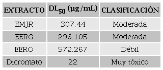 Los resultados mostrados en la Tabla 4 corresponden a la actividad de los extractos en estudio, la clasificación de toxicidad se asigna de acuerdo con lo establecido por Nguta et al., 2011 donde los extractos pueden clasificarse de acuerdo con su DL50 en: No tóxicos (DL50 ≥ a 1000 µg/ mL), débilmente tóxicos (DL50 de 500 a 1000 µg/mL), moderadamente tóxicos (DL50 de 100 a 500 µg/mL) y fuertemente tóxicos (DL50 ≤ 100 µg/mL). Para extractos hidroalcohólicos de R. officinalis se han reportado valores de DL50 de 470 µg/ mL (Kabubii et al., 2015) y 230 µg/mL (Perales Martínez, 2019) clasificándolos como débilmente tóxicos, coincidiendo con lo obtenido para el EERO en estudio. Para el EMJR se encuentra que las DL50 obtenidas en este estudio son menores a las reportadas por otros autores (Aranda-Ventura José et al., 2017; Martínez-Báez Adbel Z. et al., 2016), quienes reportan DL50 ≥ 1000 µg/mL, clasificando sus extractos como no tóxico. Referente a las DL50 del EERG se encuentran reportados resultados muy variados que van desde 5.39 µg/mL (Hamidi et al., 2014) hasta 2,200 µg/mL (Mahboob et al., 2015), las diferencias en las dosis reportadas en los diferentes extractos se relacionan con factores abióticos, métodos y solventes utilizados para la extracción que afectan de forma directa el tipo y cantidad de metabolitos presentes y repercuten de forma directa en la actividad que muestra el extracto.