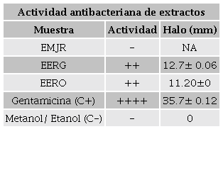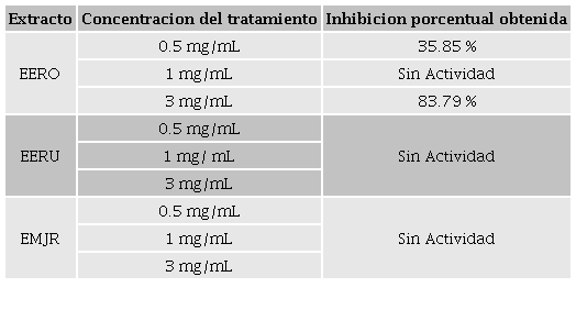De los extractos en estudio el EERG fue el extracto que mostró mejor actividad antimicrobiana, generando el halo de inhibición más extenso, así como la menor MIC, no mostró capacidad para inhibir la formación de la biopelícula, fue el extracto con menor actividad antioxidante y una actividad tóxica moderada. El EERO fue el único de los extractos que demostró la capacidad para inhibir la formación de la biopelícula, actividad tóxica débil y una mejor actividad antioxidante en comparación con el EERG. El EMJR fue el extracto que mostró la mayor actividad antioxidante entre extractos e incluso mayor que el ácido ascórbico utilizado como control, actividad tóxica moderada y nula actividad antibacteriana y sin capacidad para inhibir el crecimiento de la biopelícula. Los resultados obtenidos demuestran que los extractos analizados manifiestan actividad biológica contra H. pylori y podrían ser utilizados como fuente de compuestos en la búsqueda de alternativas para el tratamiento contra esta bacteria.