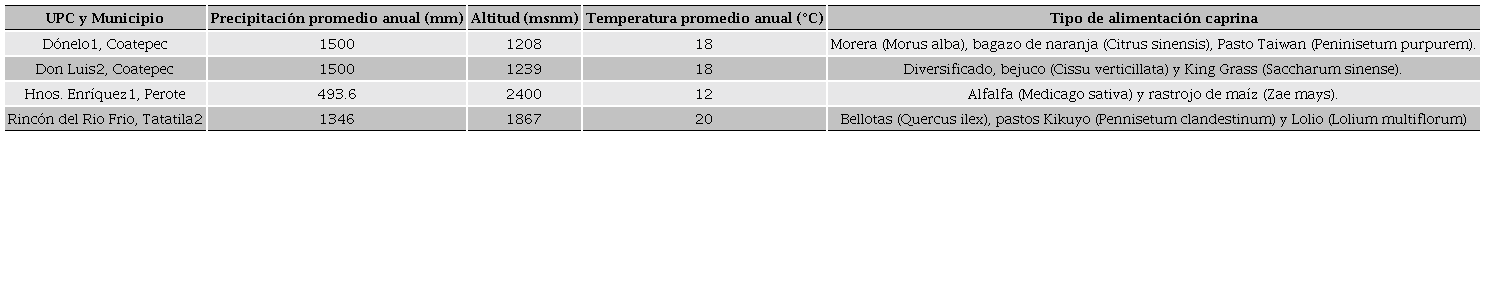 Se consideró una muestra de las Unidades de Producción Caprina (UPC) del Sistema Producto Especie Caprinos de Veracruz, A.C. (SIPECAV). La muestra comprende a cuatro UPC que pertenecen a los municipios de la zona montañosa central y el Altiplano del Estado de Veracruz. Estas UPC son representativas debido a su producción de leche de cabra y elaboración de productos lácteos como quesos artesanales (Ramírez-Rivera et al., 2017). Las razas de cabras predominantes en las UPC son Alpina y Saanen. En la Tabla 1 se muestran las condiciones agroclimáticas, así como el tipo de alimentación usado en estas UPC.