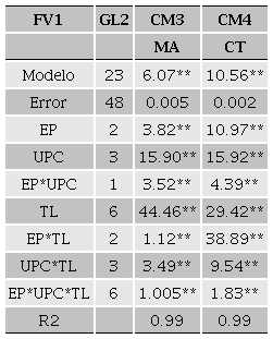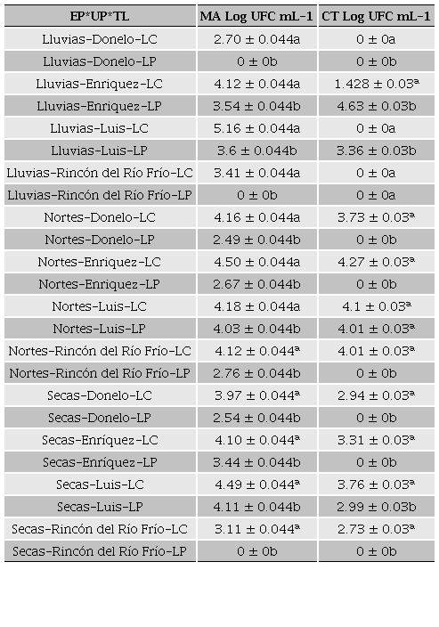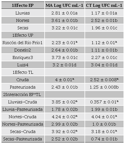 En la Tabla 2 se muestran los resultados de los efectos considerados en esta investigación. Se observa que todos los efectos evaluados fueron estadísticamente significativos (p < 0.01) para las variables microbiológicas MA y CT. Cabe mencionar que hubo ausencia de E. coli, S. aureus, Salmonella ssp. y B. melitensis en todas las leches evaluadas. Este resultado confirma la aplicación de buenas prácticas de ordeña usadas en las diferentes UPC. Por lo tanto, la Época del año (EP) incide significativamente (p < 0.01) en el contenido de MA y CT, esto concuerda con Tormo et al. (2011), quienes demostraron que las condiciones de producción y la época tiene un efecto importante en el perfil microbiológico de la leche de cabra. En donde, el contenido de MA de las leches producidas en las épocas lluvias, nortes y secas fueron 2.81, 3.61 y 3.22 Log UFC mL-1, respectivamente. Para el caso de CT, los valores encontrados fueron de 1.17, 2.52 y 1.96 Log UFC mL-1 respectivamente (Tabla 3). Estos resultados son diferentes a los presentados por Tormo et al. (2011) quienes obtuvieron valores de MA y CT de 0.23 y 1.17 Log UFC mL-1 respectivamente en leches de cabra producidas en UP de Francia durante el mes de febrero. Esta diferencia puede deberse a las condiciones de producción y temperaturas que influyen en la multiplicación microbiana. Respecto al efecto de UP, se encontró que las leches producidas en las UP Luis y Hnos. Enríquez presentaron el mayor conteo microbiano de MA de 3.2 y 3.73 Log UFC mL-1 a comparación de las leches de las UP Donelo y RRF quienes tuvieron conteos de MA < 3 Log UFC mL1 (Tabla 3). Los resultados del efecto Tipo de leche (TL) (Tabla 3) indicaron que la pasteurización contribuyó a la reducción de la carga microbiana de MA (4.00 a 2.43 Log UFC mL-1) y CT (2.52 a 1.25 Log UFC mL-1). Sin embargo, con la interacción Época del año por Tipo de leche (EP*TL) se encontró la mayor incidencia microbiológica de MA en leches crudas en las épocas de nortes (4.24 Log UFC mL-1) y secas (3.92 Log UFC mL-1). Aunque, posterior a la pasteurización esta carga de MA mostro una reducción de 2.52 y 2.99 Log UFC mL-1 para las mismas épocas. Las cargas de MA en las le-ches pasteurizadas están por debajo del límite 4.47 Log UFC mL-1 establecido por la (NOM-091-SSA1-1994). La reducción de MA demuestra el efecto positivo del tratamiento térmico de la leche usado en las diferentes UP consideradas en esta investigación (Kousta et al., 2010). Las cargas más altas de CT en leches crudas fueron 4.04 y 3.18 Log UFC mL-1 (épocas de nortes y secas, respectivamente), este resultado se redujo a valores de 1.00 y 0.74 Log UFC mL-1 para las mismas épocas. Las cargas microbianas de CT posteriores a la pasteurización se encuentran en el límite máximo (1.00 Log UFC mL-1) establecido en la (NOM-243-SSA1-2010. Sin embargo, en la época de lluvias se encontró que la leche cruda presentó menor carga de CT (0.35 Log UFC mL-1) respecto a la leche pasteurizada (1.99 Log UFC mL-1). Esto pudo deberse a una posible contaminación post-pasteurización ocasionado por la falta de limpieza y desinfección en equipos, utensilios y por los posibles tiempos prolongados (superiores a 48 h) de almacenamiento a temperatura ambiente (Yamazi et al., 2013). Los resultados de la interacción Época del año por Unidad de producción por Tipo de leche (EP*UPC*TL) mostró que las leches sin procesamiento térmico de las UP Luis y Hnos. Enríquez producidas en la época de nortes (4.18 y 4.50 Log UFC mL-1) y lluvias (5.16 y 4.12 Log UFC mL-1) presentaron el mayor contenido de MA. Para CT el mayor conteo se presentó en la época de nortes y en las leches crudas producidas en las UP de Luis (4.10 Log UFC mL-1) y Hnos. Enríquez (4.27 Log UFC mL-1) (Tabla 4). Los resultados mostrados coinciden con los reportados por Delgado-Pertiñez et al. (2003) quienes observaron la mayor incidencia de bacterias MA y CT en los meses de diciembre, enero y febrero (4.94, 5.09 y 4.92 Log UFC mL-1) pertenecientes a la época de nortes.