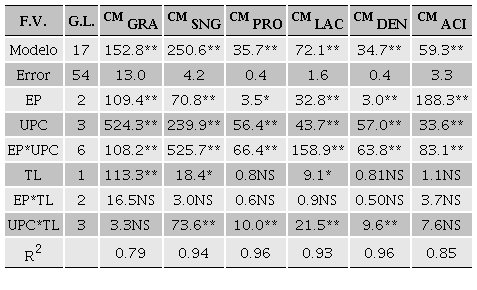 Dónde: Yijkl = variable de respuesta; µ efecto común, EPi efecto de la i-ésima época; UPj = efecto de la j-ésima UP; TLk = efecto del k-ésimo tipo de leche; EP*UPij = interacción de la época x UPC; UP*TLjk = interacción de la UP x tipo de leche; EP*TLik = interacción época x tipo de leche; Eijkl = Error aleatorio con media 0 y varianza del error σε2. También se calcularon los coeficientes de determinación R2 de cada modelo. Para el tratamiento estadístico de los datos se usó el procedimiento de GLM del programa estadístico SAS® versión 9.4 (Statistical Analysis Systems Institute Inc, U.S.A).