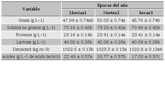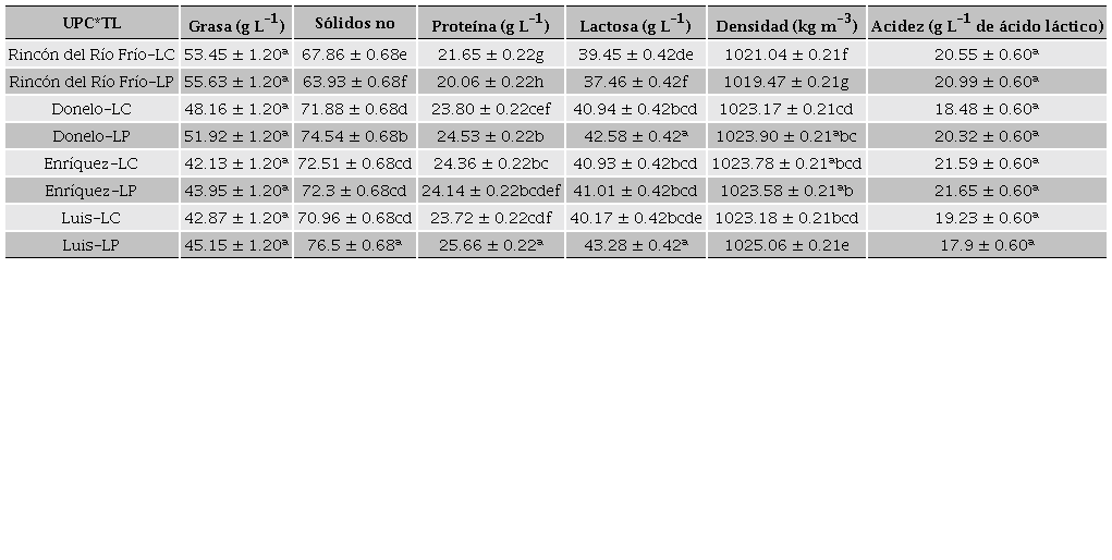 Los efectos analizados para cada variable fisicoquímica se muestran en la Tabla 5. Se observa que todos los efectos e interacciones fueron significativo con excepción de la interacción EP*TL. Los valores de R2 (0.76 - 0.96) demuestran el alto nivel de explicación del modelo aplicado. Analizando la significancia de cada efecto por variable se encontró que para el contenido de Grasa todos los efectos fueron significativos (p < 0.05) con excepción de las interacciones EP*TL y UPC*TL. En el caso de Sólidos No Grasos solamente el efecto la interacción EP*TL no tuvo efecto significativo (p >0.05). Para el contenido de Proteína se observó diferencias significativas en todos los efectos con excepción de las interacciones TL y EP*TL. En el caso del contenido de Lactosa solamente la interacción EP*TL no se encontraron diferencias significativas. Para la Densidad todos los efectos fueron significativos con excepción de TL y EP*TL. Para el contenido de Acidez se observaron que los efectos TL, EP*TL y UPC*TL no fueron significativos. Para el efecto EP los mayores contenidos de Grasa y Sólidos No Grasos se obtuvieron en las épocas de nortes (50.03 g L-1) y lluvias (70.16 g L-1) (Tabla 6). De acuerdo con Todaro et al. (2005), la leche con contenidos altos de grasa puede deberse al consumo de pasturas ricas en proteínas generadas en esas épocas. Los mayores contenidos de Proteína (23.91 y 23.41 g L-1) y Lactosa (42.08 y 40.09 g L-1) se mostraron en las épocas de nortes y secas (Tabla 6). Lo anterior puede deberse a que las cabras muestran su mayor desempeño productivo en las épocas antes mencionadas (Midau et al., 2010). Sin embargo, Fekadu et al. (2005) observaron que los mayores contenidos de proteína de las leches de Estados Unidos se producen en los meses de septiembre a octubre. Por su parte, Mayer y Fiechter (2011) mostraron que los contenidos altos de Grasa, Sólidos No Grasos, Proteína y Lactosa de leches producida en Austria se han obtenido en las épocas de nortes y lluvias. Aunque la diferencia de la composición nutrimental de la leche caprina producida entre las épocas también puede atribuirse a la calidad de la pastura y al consumo energético de las cabras para su locomoción en búsqueda de forraje (Steinshamn et al., 2014). Sin embargo, se observó la existencia de una relación inversa entre las variables Grasa y Lactosa, este mismo efecto fue observado por Grimley et al. (2009) en leches producidas en los meses de primavera (marzo a junio). En el caso de la Densidad se encontraron diferencias (p < 0.05) entre las épocas evaluadas y siendo la época de norte donde se encontró una mayor densidad en la leche. Los valores de Densidad encontrados en esta investigación son consistentes con los reportados por Iancu (2010) y Chen et al. (2014) quienes evaluaron leches de cabra de Rumania y Noruega y reportaron rangos de densidad de 1029 - 1033 y 1028 kgm-3, respectivamente. El mayor contenido de Acidez se obtuvo en las épocas de lluvias y nortes (22.49 y 20.77 g L-1 de ácido láctico, respectivamente), este resultado pudo estar asociado con el incremento de la carga microbiana generado en dichas épocas. El análisis del efecto UPC demostró que los contenidos mayores de Grasa se obtuvieron en las UPC Rincón del Rio Frio y Donelo (54.54 y 50.04 g L-1, respectivamente) a comparación de las UPC Luis y Hnos. Enríquez (44.02 y 43.04 g L-1, respectivamente) (Tabla 7). Las diferencias en los contenidos de Grasa entre UPC están en función del tipo de alimentación caprina. De acuerdo con Todaro et al. (2005), Brodziak et al. (2014), Park et al. (2007), Salvador et al. (2014), la alimentación diversificada contribuye a un menor balance energético del animal provocando una mayor movilización de la grasa corporal para la síntesis de la grasa de la leche. Por su parte, Morand-Fehr et al. (2007) mencionaron que los altos contenidos de grasa en las leches pueden darse cuando hay una mayor proporción de forraje natural en la dieta caprina. Los contenidos mayores de Sólidos No Grasos, Proteína y Lactosa se obtuvieron en las leches de las UP Donelo (73.21, 24.17 y 41.76 g L-1, respectivamente), Hnos. Enríquez (72.41, 24.25 y 40.97 g L-1, respectivamente) y Luis (73.73, 24.69 y 41.73 g L-1, respectivamente). Sin embargo, en la UPC Rincón del Rio Frio, las variables fisicoquímicas Sólidos No Grasos, Proteína y Lactosa (65.90, 20.86 y 38.46 g L-1, respectivamente) mostraron un efecto contrario al resto de las leches producidas en el resto de las UPC. Este resultado puede atribuirse a dos razones: 1) el uso de forrajes de calidad deficiente y 2) a los gastos energéticos de las cabras derivados por el pastoreo (Park et al., 2007; Inglingstad et al., 2014). En el caso de la Densidad se observó que las leches producidas en las UPC Donelo (1023.54 kg m-3), Hnos. Enríquez (1,023.54 kg m-3) y Luis (1,023.54 kg m-3) estuvieron próximos al valor de 1,028 kg m-3 propuesto por Park et al. (2007). Sin embargo, la leche de la UPC Rincón del Rio Frio presentó el valor más bajo de Densidad (1020.25 kg m-3). Acorde a Park et al. (2007) este efecto pudo estar asociado a dos factores: 1) al estado avanzado de lactancia de las cabras y 2) a la adición de agua a la leche. Respecto al contenido de Acidez las leches producidas en las UPC Hnos. Enríquez y Rincón del Rio Frio (21.63 y 20.78 gL-1 de ácido láctico) presentaron los mayores contenidos respecto las leches de las UPC Donelo y Luis (19.41 y 18.75 gL-1 de ácido láctico). Los valores de Acidez de esta investigación son superiores al valor de 15 g.L-1 de ácido láctico observado por Villalobos y Castro (2009). Los contenidos altos de Acidez de las leches producidas principalmente en la UP Hnos. Enríquez y Rincón del Rio Frio pudieron estar asociados a la contaminación microbiológica o a la falta de implementación de las buenas prácticas de higiene y manejo de la leche. Los efectos del Tipo de leche (TL) se obs