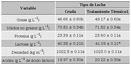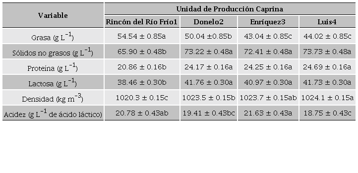 En todas las muestras se determinaron por triplicado los contenidos (g L-1) grasa, Sólidos No Grasos, Proteína, Lactosa y Densidad (kg m-3) mediante un analizador por ultra-sonido Lactoscan S (Milkotronic Ltd., Nova Zagora, Bulgaria). La determinación de la acidez titulable (g L-1 de ácido láctico) o Acidez (ACI) se efectuó acorde al método 947.05 (AOAC, 2005) en el cual se adicionó 1 mL de la solución (0.5 % p/p) de fenolftaleína en 10 mL de leche de cabra y posteriormente la mezcla fenolftaleína-leche de cabra fue titulada con NaOH (0.11 N) hasta que la muestra alcanzó una tonalidad rosa consistente por 5 s.