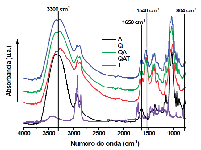 Espectroscopia de infrarrojo (FTIR). Se utilizaron muestras de las PCs de A, Q, QA, QAT con una dimensión de 1 x 1 cm2, espesor de 0.1 mm y se registraron los espectros de IR usando un espectrómetro FT-IR Thermo ScientificTM Nicolet iS-50 (Madison, WI. USA.), empleando la técnica reflectancia total atenuada (ATR-Attenuated Total Reflection). En el caso del aceite esencial de tomillo (T) este fue analizado en estado líquido. Los espectros se registraron de 4000 a 650 cm-1 con una resolución de 4 cm-1, una velocidad de escaneo de 0.475 cm-1/s y 64 escaneos.