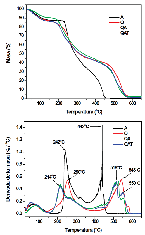 En el análisis termogravimétrico de las películas de QA y QAT, la descomposición se presenta en tres etapas (Figura 2). La primera descomposición corresponde a la liberación del agua libre (5.5 a 10 %) o humedad (> 100 °C), la incorporación de aceite de tomillo no afecta la evaporación del agua. La segunda descomposición se presenta con una inflexión más prolongada, que corresponde a la descomposición de los biopolímeros en el intervalo de 185 - 310 °C y una tercera y última descomposición, entre 395 - 585 °C. Esto coincide con Balau et al. (2004) reportan que las PC de Q se descomponen en 2 etapas, la primera inicia a 180°C y termina cerca de 300 °C, con un máximo descomposición de alrededor de los 255 °C. Esta descomposición se atribuye a un proceso que incluye la deshidratación, depolimerización y descomposición de las unidades acetiladas y desacetiladas de los polímeros. La última descomposición inicia a los 540 °C y probablemente se deba a los procesos termo-oxidativos (Balau et al., 2004). Kanmani y Rhim (2014) reportaron que las películas de A mostraron un segundo pico de degradación menos prolongado entre 220 - 250 °C. Además, se han reportado tres etapas en la degradación térmica del agar. Estas etapas de degradación térmica se observan a 90, 250 y 325 °C. La primera degradación fue principalmente atribuida a la evaporación del remanente de agua. La segunda y tercera etapa es la degradación que puede ser debida a la descomposición del glicerol (plastificante) y del biopolímero de agar, respectivamente (Rhim et al., 2006). Similarmente, Campa-Siqueiros et al. (2020) reportó la descomposición térmica de PC basadas en A, la cual presenta una primera descomposición térmica alrededor de los 260 °C y una segunda a 452 °C. Altiok et al. (2010) mencionan que la primera descomposición corresponde al efecto endotérmico atribuida a la evaporación de los solventes (ácido acético, etanol, agua) usada en la preparación de PC de Q. Mientras el efecto exotérmico ocurre a alta temperatura, la cual es atribuida a la descomposición del polímero. Si bien, el A y el Q tienen temperaturas de descomposición diferentes en las dos etapas, es importante señalar que los termogramas de las PC de Q, QA y QAT, estos fueron muy similares. Lo anterior, nos permite aseverar que los componentes tienen una buena miscibilidad, ya la temperatura de descomposición se encuentra entre sus componentes puros (Q y A).