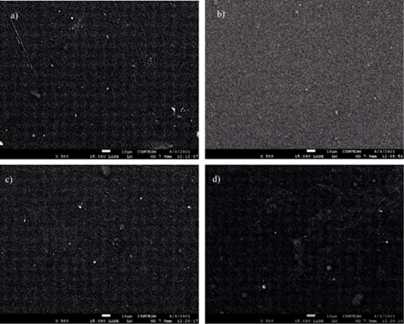 La morfología superficial de las PCs se muestra en la Figura 3. En la PC de A (Figura 3a) y la Q (Figura 3b) se observa que ambas películas presentan uniformidad en la superficie, la cual presenta una superficie lisa y sin poros. La PC de QA (Figura 3c) presenta una superficie homogénea, lo cual indica que tanto el Q como el A se mezclaron homogéneamente a nivel de microdominios, ya que no se ven evidencias de separación de fases. No obstante, se observan algunas irregularidades, como son los poros en la superficie, los cuales se atribuyen a la evaporación del solvente de la película. La adición de aceite de tomillo a la PC de QAT produjo modificaciones en la superficie, como son el aumento de la rugosidad y opacidad (Figura 3d). En la superficie de esta PC se observaban más poros, en comparación de QA; esto se puede deber a la presencia de pequeñas burbujas con la adición de aceite de tomillo. Los poros se pueden deber a la evaporación del solvente del quitosano (ácido acético) que posee una menor presión de vapor, en comparación con la del agua. Sin embargo, las PCs muestran cierto grado de uniformidad, por lo cual hace posible su uso como recubrimiento de alimentos.