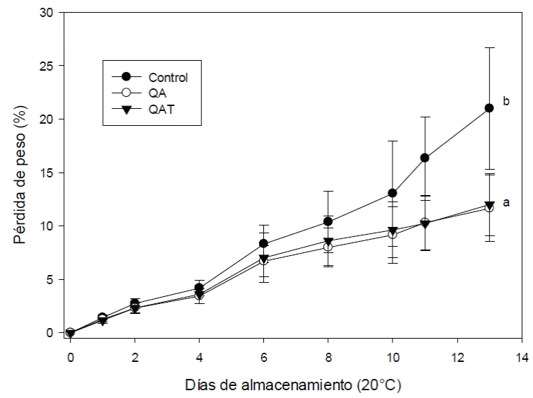 La pérdida de peso fue aumentando gradualmente durante el almacenamiento; a partir del día 7 se observó que los frutos control presentaron valores mayores (p < 0.05) respecto a los frutos recubiertos. Los RCs de QA y QAT redujeron un 40 % de pérdida de peso después de 13 días a 25 °C de almacenamiento, en comparación al Control (Figura 4). Estas diferencias significativas de pérdida de peso se atribuyen a que los RCs forman una barrera en la superficie del fruto que reduce la pérdida de agua por transpiración y, por lo tanto, pérdida de agua; además, limitan el intercambio de gases de O2 y CO2 (Aguilar-Méndez et al., 2008).