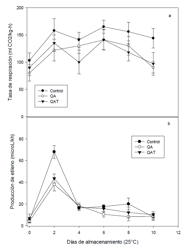 La producción de etileno disminuyó durante el almacenamiento a 25 °C por 10 d, no observándose diferencias significativas (p < 0.05) entre los frutos control y con los RCs. La producción de etileno presentó un máximo al día 2, con valores de 82, 34 y 46 µL kg-1h-1 para el Control, QA y QAT, respectivamente para después disminuir sus valores.