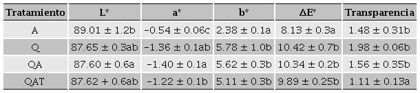 La transparencia en la película de Q fue superior al de las otras tres películas (A, QA y QAT) que incluyeron agar en su formulación, se puede atribuir a que el agar es ligeramente opaco (Tabla 1).
