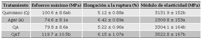 El módulo de elasticidad está relacionado con la rigidez de las películas. Se observa que las PCs que contienen Q se caracterizan por presentar los valores mayores de módulo elástico, los cuales son superiores a los registrados en la película de A (p < 0.05). La película QAT posee el mayor valor promedio de módulo de elasticidad, en comparación a las PCs formuladas, lo cual indica que la mezcla de los componentes de esta película presenta una sinergia que indica buena cohesión, sin separación de fases, pero reduce en cierto grado la flexibilidad de la película. Sin embargo, dada la aplicación que se les pretende dar a las PCs como es de recubrimientos de frutas y vegetales la formulación de QAT presentó buenas propiedades mecánicas en comparación a las demás formulaciones, ya que presento mayores valores de esfuerzo máximo y elongación a la ruptura. Es importante señalar que la elongación es la deformación del material, y se considera que es un factor en la selección de las PCs, porque representa la capacidad que posee la película para absorber y disipar el esfuerzo mecánico al que es sometida (Madera-Santana et al., 2011).