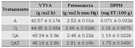 Velocidad de transmisión al vapor de agua (VTVA) y permeancia. La VTVA de las PCs de QAT presentó mayores valores (p<0.05), en comparación con las demás PCs (Tabla 3). Estos resultados coinciden con lo reportado por Altiok et al. (2010), quienes observaron un aumento de la VTVA de las PC de Q con la adición de aceite de tomillo, atribuyendo dicho incremento a la formación de estructuras de poros con la adición de aceite de tomillo, como se observó en las micro-grafías de MEB. Respecto a las PCs de A, Q y QA, mantuvieron similares valores de VTVA.