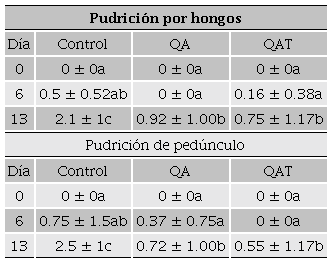 En lo que respecta a la pudrición del pedúnculo se tuvo un comportamiento muy similar, donde al día 6 se empezaron a presentar la incidencia de pudriciones (Tabla 4). Los frutos con los RCs presentaron menor desarrollo de pudriciones. Los frutos con RC de QAT no presentaron incidencias de pudriciones de pedúnculo al día 6 de almacenamiento hasta el día 10; esto se atribuye a la actividad antimicrobiana del quitosano y aceite de tomillo. La pudrición peduncular del aguacate se presenta en postcosecha, es un factor que limita su comercialización y exportación. Las restricciones del uso de fungicidas convencionales limitan su uso, por lo cual la aplicación de compuestos como el Q se pudiera utilizar en el control de esta pudrición.