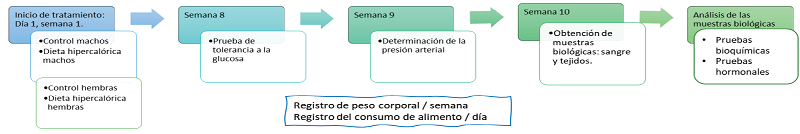 Los animales utilizados fueron tratados de acuerdo con la Guía del cuidado de animales mexicana para el estudio con animales de laboratorio (NOM-062-ZOO-1999) y el protocolo fue aprobado por el Comité de Ética para animales de estudio de la Escuela Nacional de Ciencias Biológicas. Se emplearon 24 ratones CD1 hembras y machos de edad pre púber (obtenidos por el proveedor PROPECUA), los animales se mantuvieron en jaulas metálicas individuales, en una cámara aislada, con ciclos de 12 h luz/obscuridad, temperatura regulada a 22 ± 2 ºC y acceso a agua y alimento ad libitum. Los ratones se distribuyeron en 2 lotes por género, con 6 ratones cada uno, y se asignaron a los tratamientos: a) Testigo hembras, b) Dieta hipercalórica hembras, c) Testigo machos, d) Dieta hipercalórica machos. La duración del tratamiento fue de 10 sem. El peso corporal se registró cada semana y el consumo de agua y alimento diariamente.