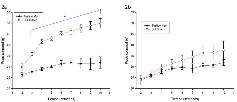 En todos los grupos los ratones aumentaron de peso gradualmente durante el tratamiento. Los ratones macho DHC mostraron un aumento significativo en el peso corporal a partir de la tercera semana (p < 0.005), al final de las 8 semanas aumentaron 68 % de peso, mientras que el grupo control en machos solo incrementó 8 % (Fig. 2a). En cuanto a las hembras no existe diferencia significativa entre los dos grupos (Fig. 2b), sin embargo, las de DHC aumentaron 55 % su peso corporal, mientras que las del grupo control solo el 15 %.
