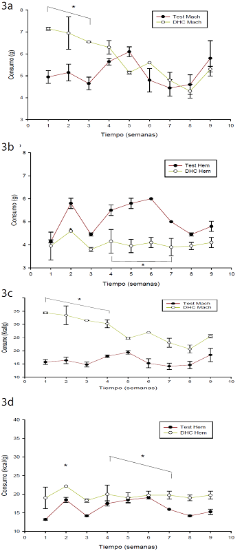 El consumo de dieta hipercalórica se cuantificó en gramos y calorías. En la Figura 3a se observa que, en machos en ambos tratamientos, existe diferencia significativa de la primera a la tercera semana de consumo en gramos siendo superior el consumo de la dieta hipercalórica. En cuanto a consumo por kcal (Figura 3b), es mayor en la dieta hipercalórica con diferencia significativa de la primera a la cuarta semana del tratamiento. El consumo en gramos (Figura 3c) en las hembras tiene un comportamiento diferente a los machos, pues se observa que el grupo que se le proporcionó la dieta estándar consumieron más cantidad que los de la dieta hipercalórica con diferencia significativa en la semana 2 y de la 4 a la 7; sin embargo, en la Figura 2d se reporta que, a pesar de consumir menos en cantidad de gramos, el consumo en kcal es mayor en el grupo de la dieta hipercalórica en comparación con la dieta estándar.