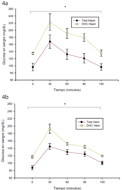En la Figura 4 se presentan los resultados de la curva de tolerancia a la glucosa en machos (4a) y hembras (4b) determinada al final del tratamiento, se observó un aumento significativo (p < 0.005) durante todo el tiempo de la prueba en los ratones DHC, tanto en hembras como en machos, en comparación con el respectivo grupo testigo, por lo que se propone que la dieta hipercalórica desarrolló intolerancia a la glucosa en los ratones.
