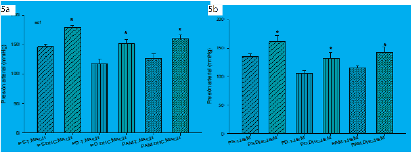 En la figura 5 se muestran los resultados de presión arterial en machos (5a) y hembras (5b). Se observa que los ratones de tratamiento DCH muestran mayor presión arterial tanto sistólica como diastólica y media comparados con los ratones con dieta estándar (p < 0.005) se observa la misma tendencia en ambos sexos.