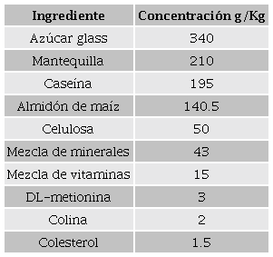 b) Dieta hipercalórica: Con una densidad energética de 4.81 Kcal/g, correspondientes a 17.3 % de proteína, 21.2% de grasas y 48.5 % de hidratos de carbono, se le adicionaron vitaminas (AIN-93-NGX) y minerales (AIN-93-VX) para complementar la dieta, la cual fue una adaptación de la dieta TD.88137 (Teklad Global Harlan Laboratories, Inc), se elaboró en el laboratorio de Farmacología del desarrollo del departamento de Fisiología de la Escuela Nacional de Ciencias Biológicas del Instituto Politécnico Nacional (Tabla 1).