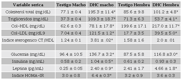 El perfil hormonal incluye la insulina y la leptina, los resultados se presentan en la Tabla 2. Respecto a la insulina, se encontró que en machos del grupo DHC incrementó 2.5 veces más comparados con el grupo testigo, mientras que en hembras de DHC el incremento fue menor, aunque si es significativo respecto del grupo testigo.