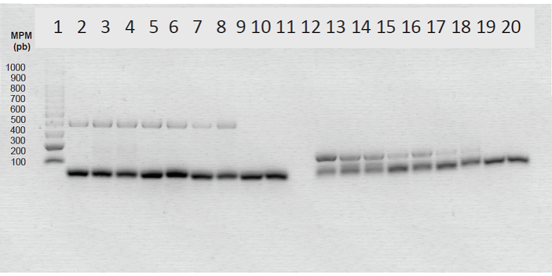 Se realizó electroforesis a los productos de amplificación en gel de agarosa al 2 % (p/v) en buffer TBE 1X (Tris 50 mM, ácido bórico 40 mM, EDTA 0.5 M), con el colorante Gel Star dilución 1:10 (Lonza U.S.A.), a 80 V por 60 min. Se utilizó marcador de 100 pares de bases (pb) (Promega, U.S.A.) (Figura 1).