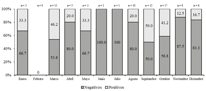 Otra característica analizada fueron las diferencias en cuanto a la época del año en que la muestra fue obtenida, observándose que la mayor proporción (n = 38; 52.7 %) de muestras se alcanzó durante el trimestre agosto-octubre, el de mayor temperatura y humedad ambiental, esta diferencia fue significativa (p < 0.001); en este trimestre, el mayor porcentaje (50.0 %) de positividad ocurrió en septiembre (Figura 2). También apreciamos que la mayor proporción (77.5 %) de muestras correspondió a pacientes menores de 18 años, aunque la tasa de positividad (40.0 %) más elevada se encontró en las muestras de niños menores de 5 años y los adultos jóvenes entre 19 y 30 años.