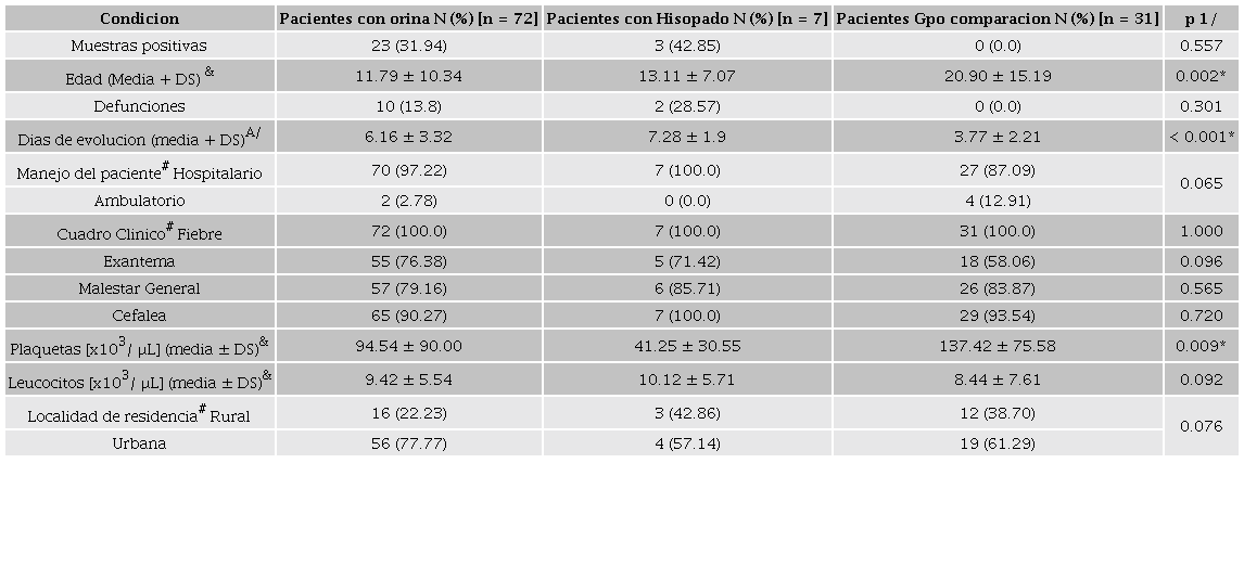 Se observó que los pacientes con sospecha de FMRR tenían un mayor promedio de días transcurridos desde el comienzo de sus síntomas que los sujetos del grupo de comparación, en los pacientes a los que se les tomó muestra de orina, en promedio tenían 6.2 ± 3.3 d, mientras en los de hisopado cutáneo la media fue de 7.3 ± 2.0. La media del grupo de comparación fue de 3.8 ± 2.2, esta diferencia también fue significativa (p < 0.001). Otra variable significativamente diferente (p = 0.009) fue la cuenta plaquetaria (x 103), con los pacientes de hisopado, mostrando los valores más bajos (41.25 ± 30.55) seguidos por los de muestra de orina (94.54 ± 90.00). Los detalles se muestran en la Tabla I.