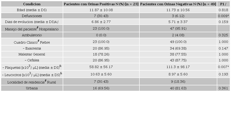 Se observó que 23 de las 72 (31.9 %) muestras de orina analizadas tuvieron un resultado confirmatorio a infección por rickettsia y que 7 (30.4 %) de esos sujetos fallecieron, mientras 3 (6.1 %) murieron en el grupo de pacientes (n = 49) negativos a R. rickettsii, lo que fue estadísticamente diferente (p = 0.009). También se encontraron diferencias significativas (p = 0.007) en el conteo de plaquetas (x 103), pues los sujetos positivos tuvieron un promedio inferior (58.82 ± 56.17) al compararlos con los pacientes con orina negativa (111.3 ± 98.17) (Tabla II). No se apreciaron diferencias significativas en las variables analizadas entre los pacientes del grupo de hisopado cutáneo.