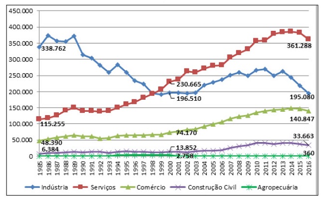 No que tange à composição setorial do emprego, coerentemente com a mudança no perfil dos estabelecimentos, a importância do setor industrial se reduz e sua participação na totalidade dos empregos cai de 66%, em 1985 (338.762 trabalhadores), para (27%), em 2016 (195.080 trabalhadores). Em contrapartida, o setor de serviços aumenta sua participação e, em 2016, passou a representar, praticamente, a metade dos empregos (49%), isto é, 361.288 trabalhadores no ABC, seguido do comércio com 19% dos empregos (140.847 trabalhadores). Vale dizer que quase 70% das ocupações formais em 2016 correspondiam ao setor terciário.